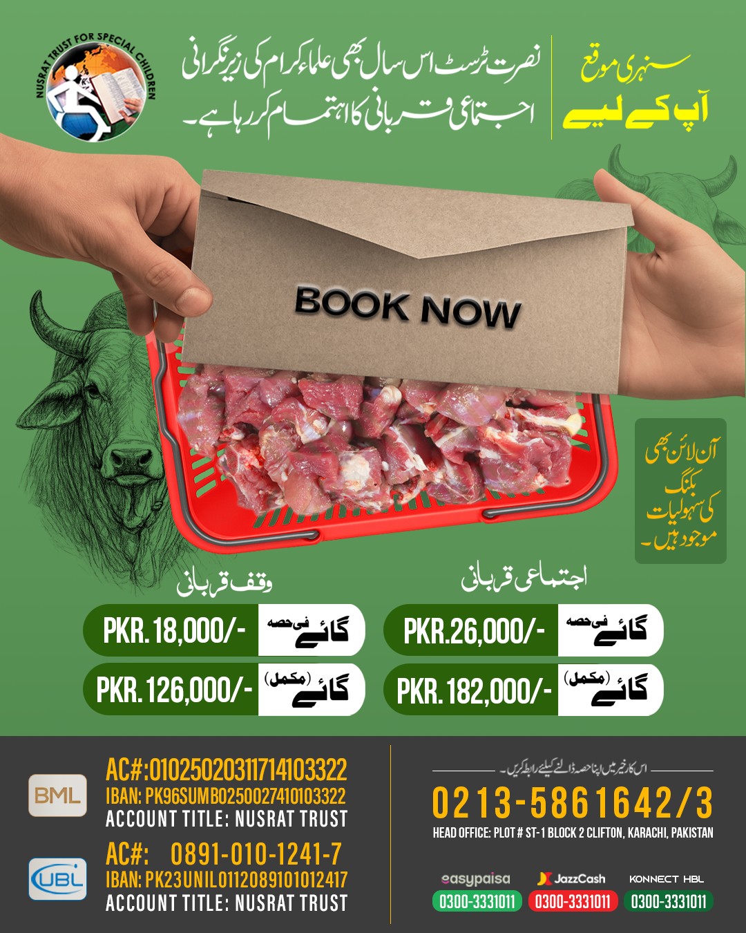 Support Nusrat Trust – Perform your Qurbani with trust and ease Book your Qurbani share through the following channels and be a source of الخير for those in need.